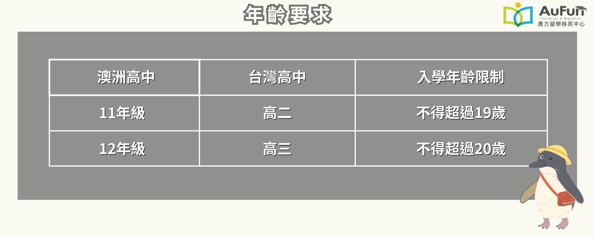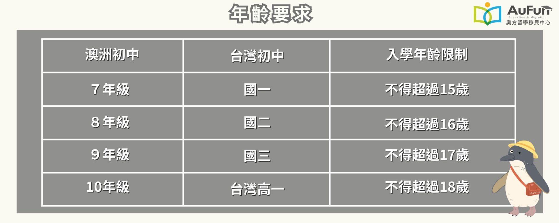 年齡對照表 (開始就讀澳洲中學課程時,倒讀不得超過18個月)