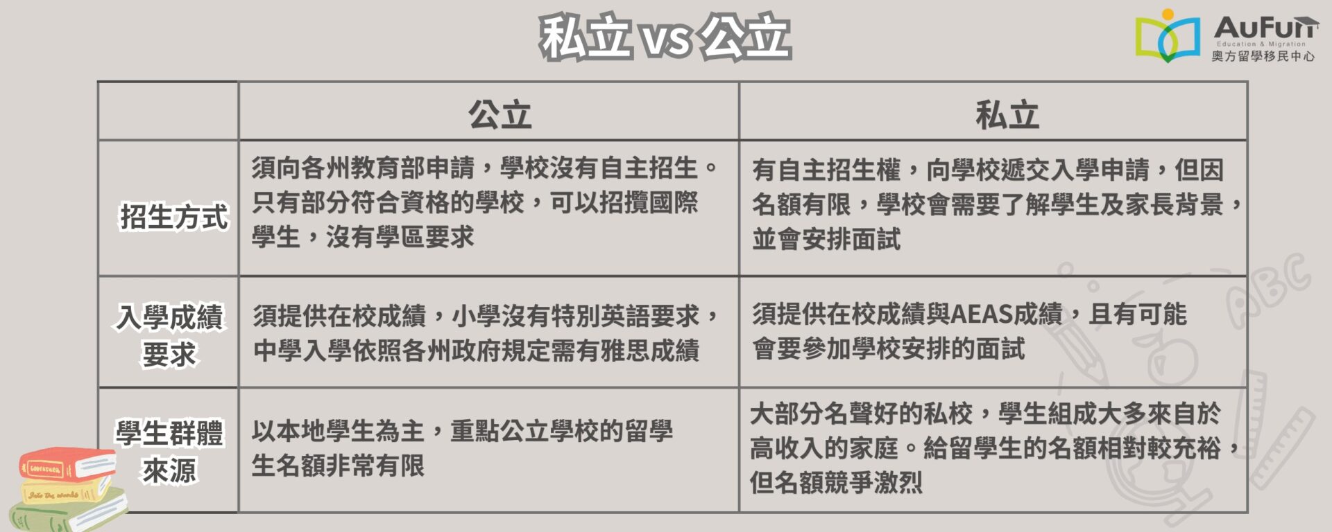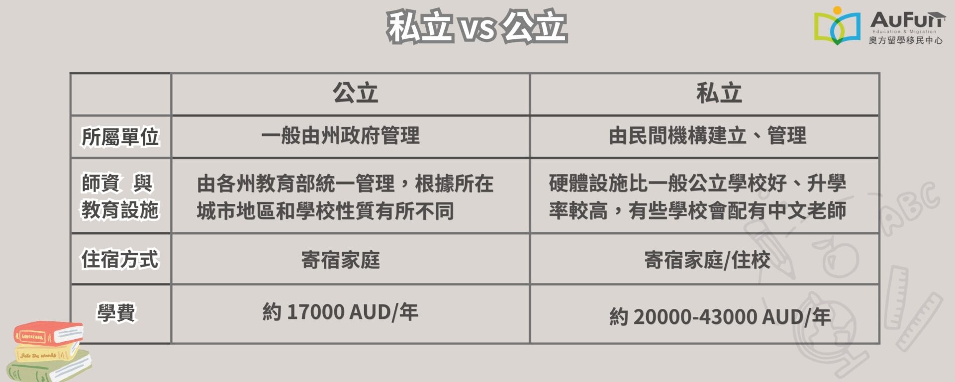 澳洲學校體系有分兩種,公立和私立。簡單從幾個重點介紹這兩者之間的差別